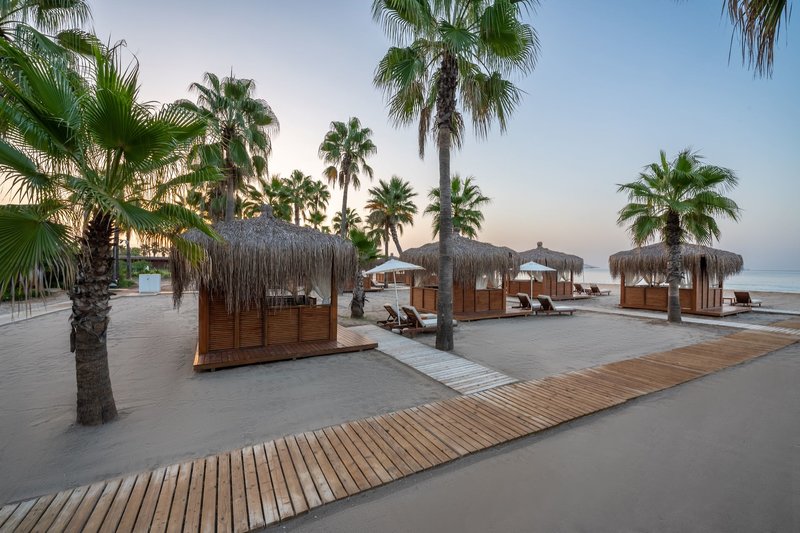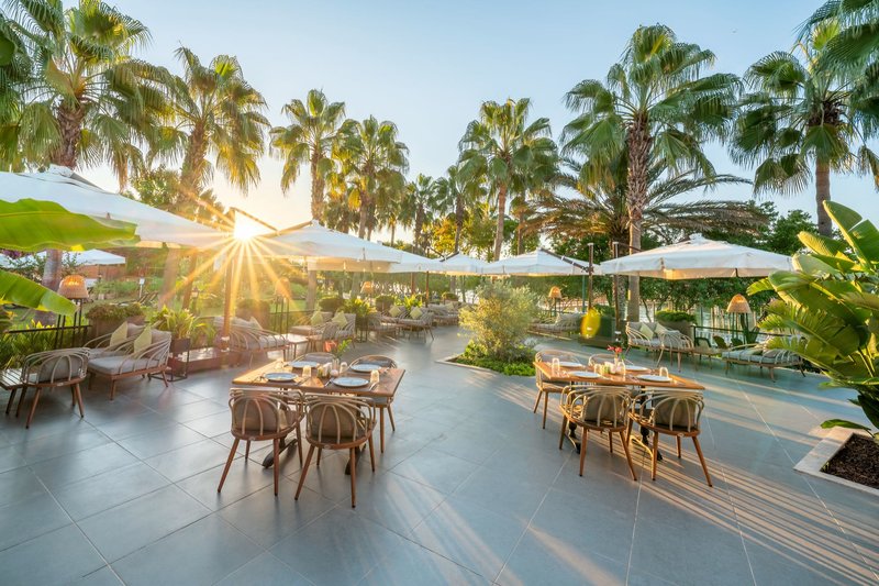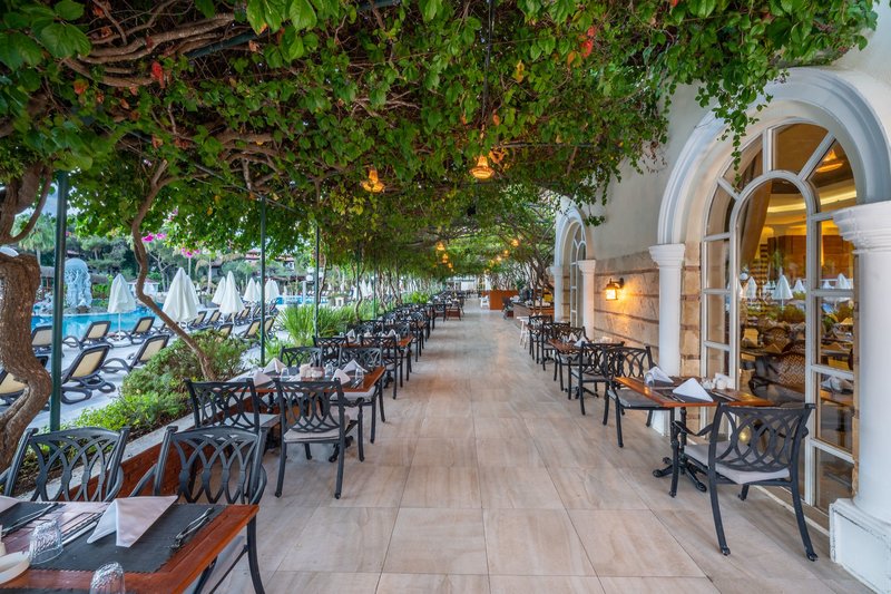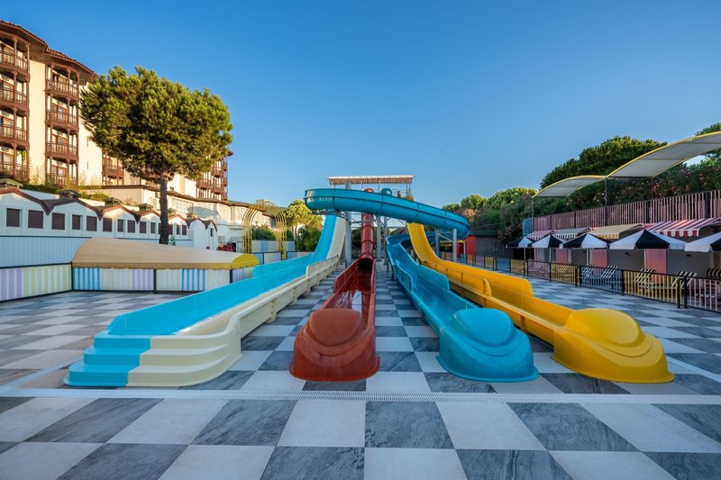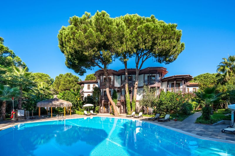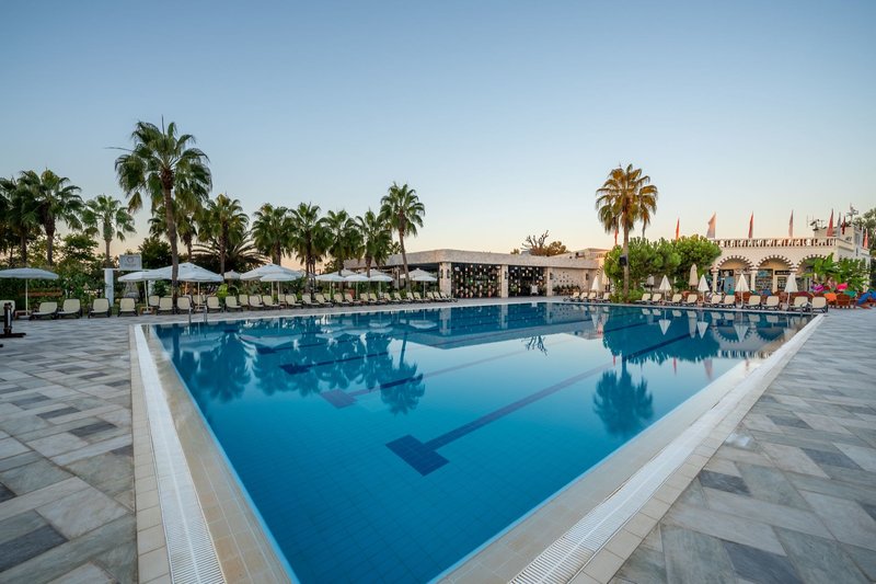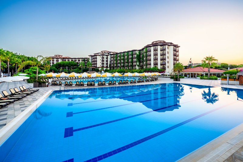 Ausstattung: Die Clubanlage, verteilt auf eine Fläche von 75.000 m², verfügt über insgesamt 455 Zimmer, die sich auf ein sechs- bis siebenstöckiges Hauptgebäude und zwei- bis dreistöckige Bungalows verteilen. Zu den Hoteleinrichtungen zählen Empfangshalle mit Rezeption und Sitzecken, ein Buffetrestaurant, mehrere À-la-carte-Restaurants, Bars, eine Gamehall, Geschäfte und ein Friseur (jeweils gegen Gebühr), Konferenzräume, Türkisches Café. Wi-Fi ist in der gesamten Anlage inklusive. Im Außenbereich befinden sich ein halbolympischer Pool, ein Hauptpool, Aquapark für Kinder und Erwachsene, zwei Relax Pools und ein beheizter Innenpool. Ein separater Kinderpool mit Wasserrutsche für Babys ist ebenfalls vorhanden. Am Pool sowie am Strand mit Pool-/Beach Bar stehen Ihnen Liegen, Auflagen, Sonnenschirme und Badetücher kostenlos zur Verfügung.