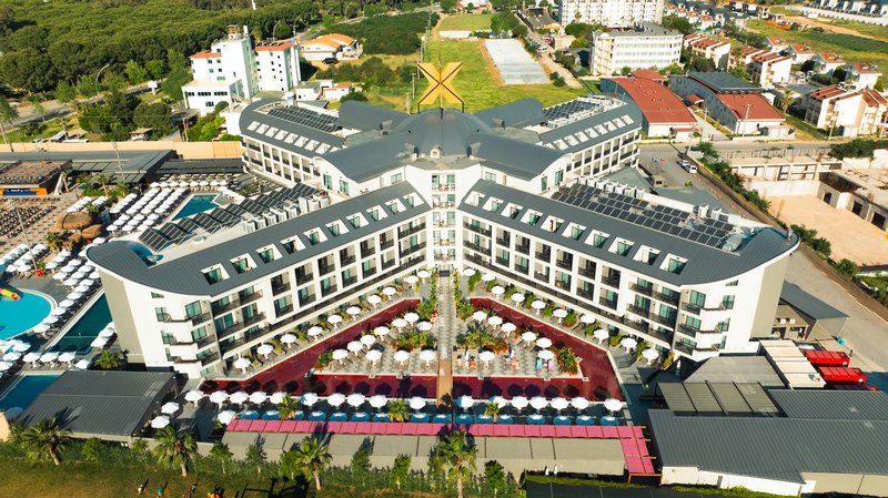 Ausstattung: Das moderne Hotel mit einem X förmigen Gebäude besteht aus vier Blöcken mit fünf Etagen (vier Aufzüge vorhanden) und bietet Ihnen 399 Zimmer. Das stylische Lifestylehotel vereint drei Konzepte unter einem Dach: Familien-, Kinder-und Erwachsenenkonzept (16+). Die elegante Empfangshalle mit Rezeption und X Lobbybar heißt Sie Herzlich Willkommen, für Ihr leibliches Wohl dient das Gourmet Hauptrestaurant, diverse À-la-carte-Restaurants (mit Voranmeldung/nach Verfügbarkeit und gegen Gebühr), darüber hinaus stehen diverse Bars, Snackstationen und eine Patisserie zur Verfügung. Wi-Fi ist in der gesamten Anlage kostenfrei nutzbar. Die Einkaufspassage mit diversen Geschäften und der Friseur sind jeweils gegen Gebühr. In der gepflegten, weitläufigen Gartenanlage befindet sich der Süßwasser Hauptpool mit separatem Kinderbecken, ein Aquapark mit 4 Wasserrutschen für Erwachsene und Kinderbecken mit 7 Wasserrutschen für Kinder sowie ein Adults Pool (ab 16 Jahren nutzbar) und ein Hallenbad (im Wintersaison offen und wetterbedingt auf Anfrage beheizbar) mit separatem Kinderbecken. Sonnenterrassen, Pool- und Snackbars runden das Angebot im Außenbereich ab. Rund um die Pools und am Strand mit Beach-/Snackbar sind Liegen, Auflagen, Sonnenschirme/Sonnendächer und Badetücher inklusive (Wechsel einmal am Tag). Im Sommer werden internationale Konzert Veranstaltungen mit DJs und Sängern sowie Showabende auf der Konzertbühne X Stage und Arena (2000-2500 Gäste Kapazität) durchgeführt.