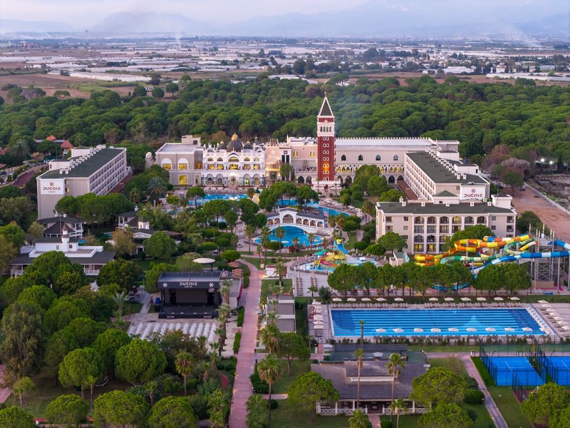 Felszereltség: A komplexum összterülete 118.000 m², és egy főépületből és melléképületekből áll, összesen 543 szobával. A különféle szolgáltatások közé tartozik a tágas előcsarnok recepcióval, kényelmes pihenősarok és lobby bár, teraszos büféétterem, különféle à la carte éttermek (előjegyzéssel és térítés ellenében), számos bár, wellness-központ, valamint egy fedett medence gyermekmedencével (télen a szálloda belátása szerint fűtött). A szobákban és a közös helyiségekben Wi-Fi biztosított. A különféle üzletek, konferenciatermek és fodrászatok térítés ellenében vehetők igénybe. A gyönyörűen parkosított kertben tágas édesvizű medence található, külön gyermekmedencével és napozóterasszal. A 3200 m²-es aquapark különféle vízi csúszdákkal kínál szórakozást felnőtteknek és gyerekeknek (nyitva órától függően, néhány csúszda kor- és magasságkorlátozott); Az olimpiai méretű úszómedence csak 18 éven felüli vendégek számára alkalmas. A napozóágyak, strandtörölközők és napernyők ingyenesen állnak rendelkezésre a medencénél és a szálloda saját, mólóval rendelkező strandján.