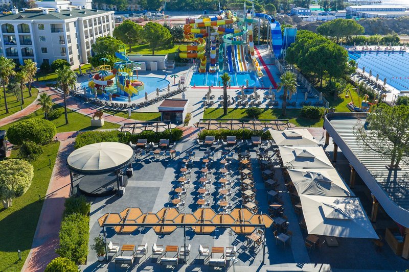 Ausstattung: Die Anlage erstreckt sich über eine Gesamtfläche von 118.000 m² und besteht aus einem Hauptgebäude sowie Nebengebäuden mit insgesamt 543 Zimmern. Zu den verschiedenen Annehmlichkeiten gehören die großzügige Empfangshalle mit Rezeption, gemütliche Sitzbereiche und Lobbybar, das Buffetrestaurant mit Terrasse, verschiedene À-la-carte-Restaurants (mit Reservierung und gegen Gebühr), mehrere Bars, ein Wellnesscenter sowie das Hallenbad mit Kinderbecken (im Winter nach Ermessen des Hotels beheizt). Wi-Fi ist in den Zimmern und den allgemeinen Bereichen inklusive. Diverse Geschäfte, Konferenzräume und Friseur sind jeweils gegen Gebühr. In der schön gestalteten Gartenanlage befindet sich die großzügige Süßwasser-Poollandschaft mit separatem Kinderbecken und Sonnenterrassen. Der 3.200 m² große Aquapark bietet mit verschiedenen Wasserrutschen Unterhaltungsmöglichkeiten für Erwachsene und Kinder (stundenweise geöffnet und bei einigen Rutschen gelten Alters- und Größenbeschränkungen) ; das olympische Schwimmbecken ist ausschließlich für Gäste ab 18 Jahren geeignet. Am Pool sowie am hoteleigenen Strand mit Badesteg stehen Liegen, Badetücher und Sonnenschirme kostenlos zur Verfügung.