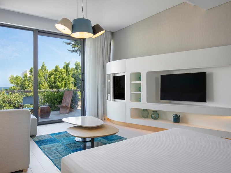 - King Junior Suite with Pool Partial Seaview (JSM1), Doppelzimmer, Nichtraucherzimmer, Meerseite, Meerblick, eingeschränkter Meerblick, Blick auf Partial Sea View, ca. 60 m², letzte Komplettrenovierung 2016, letzte Teilrenovierung 2016, Gesamtanzahl der Räume in diesem Zimmertyp: 12, 1 King Size Bett, 1 Schlafsofa, Klimaanlage, Fußboden: Laminat, Safe, Nespressomaschine, Kaffee-/Teezubereiter, Wasserkocher, Minibar, Telefon, Internet: WLAN/WiFi, Fernseher: Flatscreen, Sat-TV, Roomservice: gegen Gebühr, Reinigungsservice, Dusche, Regendusche, Badewanne, WC, Föhn, Terrasse: mit Liegestühlen, mit Private Pool, mit Privat-Garten