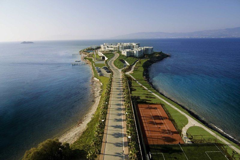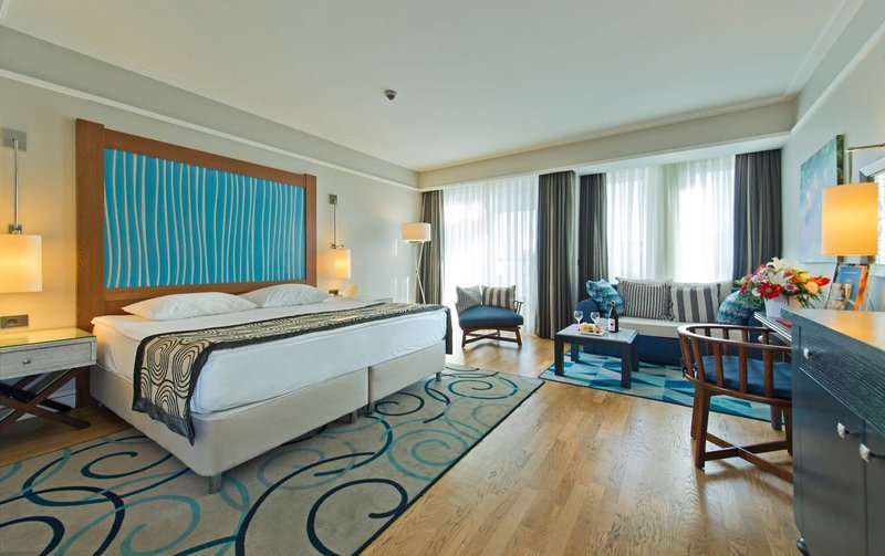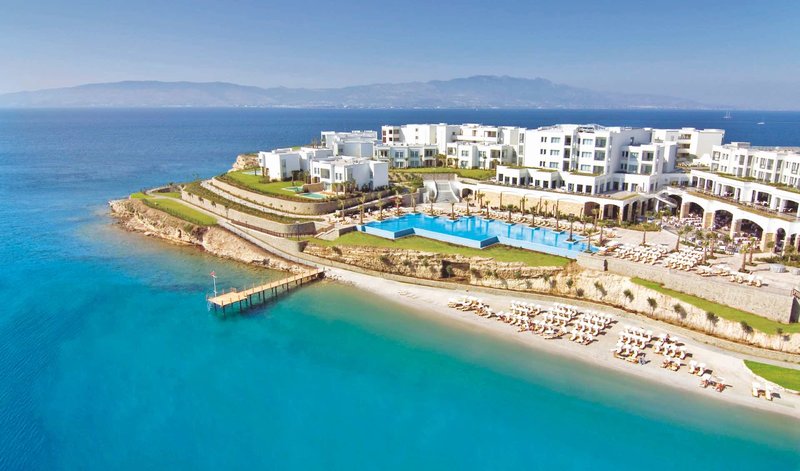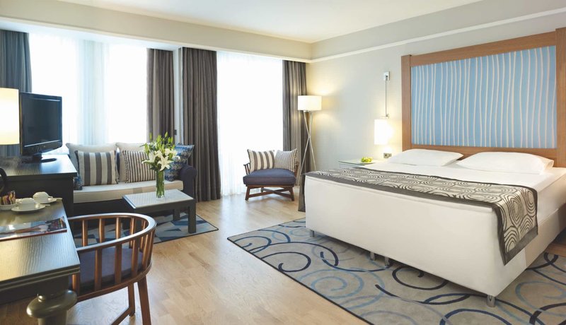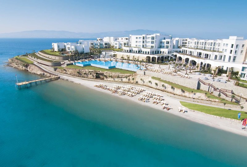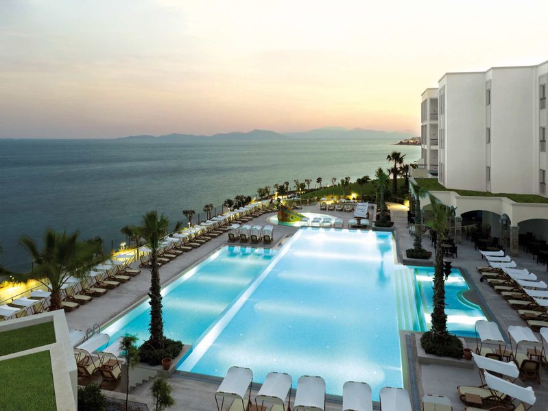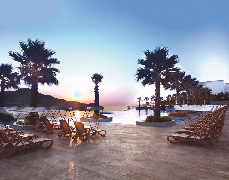 Ausstattung: Das Hotel der Luxusklasse erstreckt sich auf einer Gesamtfläche von 55.000 m² und verfügt über ein vierstöckiges Hauptgebäude und mehrere vierstöckige Gebäude mit insgesamt 222 Suiten. Zu den Annehmlichkeiten des Luxusresorts gehören die moderne Empfangshalle mit Rezeption und schicken Sitzecken, das Hauptrestaurant mit Terrassenbereich, zwei À-la-carte-Restaurants (nach Voranmeldung/Verfügbarkeit inklusive), verschiedene Geschäfte und Friseur (jeweils gegen Gebühr). Außerdem stehen Ihnen eine Game-Hall, ein Hallenbad mit separatem Kinderbecken, der professionelle Fitnesscenter und das Spa & Wellnesscenter "Shang Du" zur Verfügung. Wi-Fi ist im gesamten Hotelbereich inklusive. Im gepflegten Garten mit seinen Olivenbäumen und Palmen befinden sich insgesamt zwei große Süßwasser-Swimmingpools davon ein Relaxpool mit Panoramablick aufs Meer, ein separates Kinderbecken mit kleiner Wasserrutsche und Sonnenterrassen sowie Snackbar und Amphitheater für die Abendveranstaltungen. Liegen mit Sonnenbedachung sind am Pool sowie am Privatstrand mit Badestegen und zwei Badeplattformen kostenlos verfügbar. Badetücher am Pool kostenlos zu erhalten.