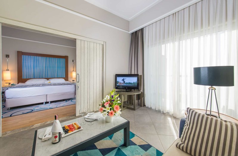 Suite Typ A (Courtyard): Die modern eingerichteten 51 m² Suiten liegen im Haupthaus und verfügen über ein Kingsizebett oder zwei Einzelbetten, Bad/WC mit Regendusche, Föhn, Bademantel, Slipper, Kissenmenü, LCD Sat.-TV mit Musikkanal, Klimaanlage (zentral), Safe, Minibar, Kaffee/Tee Setup und elektrischer Wasserkocher, eine Sitzecke mit Schlafsofa und Fliesen- oder Parkettfußboden sowie einen möblierten Balkon mit Meerblick (SA). DZ=EZ zur Alleinbenutzung (1SA).