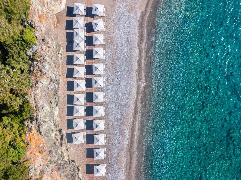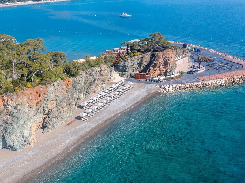 - Strand „2. Bucht (kostenplichtiges bereich)“: Sand, Kies, steil abfallend, Strandlänge: ca. 120 m, Bucht, hoteleigen, Liegen, Sonnenschirme
