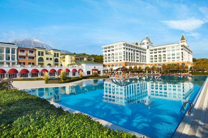 Ausstattung: Das großzügige Luxushotel im Stil eines Dogenpalastes bietet auf einer Fläche von 200.000 m² insgesamt 705 Zimmer, die sich auf drei Deluxegebäude mit jeweils sechs Etagen und mehrere dreigeschossige Clubgebäuden im Garten verteilen. In der imposanten Empfangshalle mit Rezeption, einladenden Sitzgruppen und Lobbybar werden die Gäste mit Sekt, Limonade, exklusiven Turkish Delight sowie einem Korb mit Äpfeln empfangen. Für das kulinarisches Wohl sorgen das Hauptrestaurant mit Terrasse und Kinderbuffet, mehrere Bars, Snackstationen und Hausgemachte Burgerstation, ein 24 Stunden geöffnetes À-la-carte-Restaurant, sowie diverse weitere À-la-carte-Restaurants (mit Reservierung und nach Verfügbarkeit gegen Gebühr). Zu den weiteren Annehmlichkeiten für unbeschwerte Urlaubstage zählen eine Diskothek, Nespresso und Starbucks Kaffee im Cafébereich, Wi-Fi in den allgemeinen Bereichen und Zimmern inklusive, verschiedene Geschäfte (gegen Gebühr), ein lichtdurchflutetes Hallenbad mit Whirlpool und der ansprechende Spa-Bereich mit vielen Angeboten. Im weitläufigen Garten mit viel altem Baumbestand befindet sich ein Animationsbereich, die Swimminpoollandschaft mit einem Meerwasserpool (im Winter wetterbedingt beheizt), den Süßwasserhauptpool mit separatem Kinderbecken, die beiden Pools Roma Street Relaxe und Istanbul Street Relaxe jeweils mit separaten Kinderbecken sowie den Mega Aquapark mit 15 Wasserrutschen. "Pirates of Olympus" ist verteilt auf einer 4.000m² Fläche mit einer Splashzone, Babypool und dem The Hook Aqua Bistro & Fastfood Restaurant. Außerdem Sonnenterrassen, Liegewiesen und Pool-/Snackbars. Hier und am Strand mit Badesteg und Beachbar sind bespannte Liegen, Sonnenschirme und Badetücher inklusive.