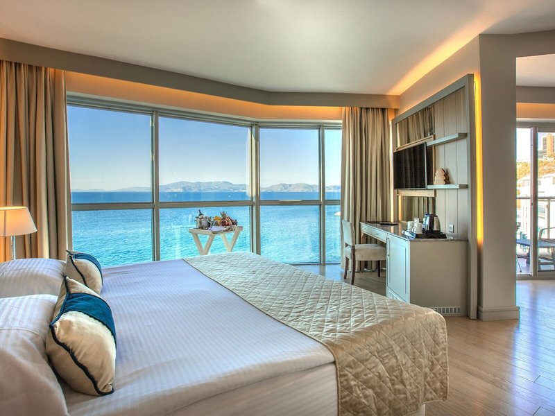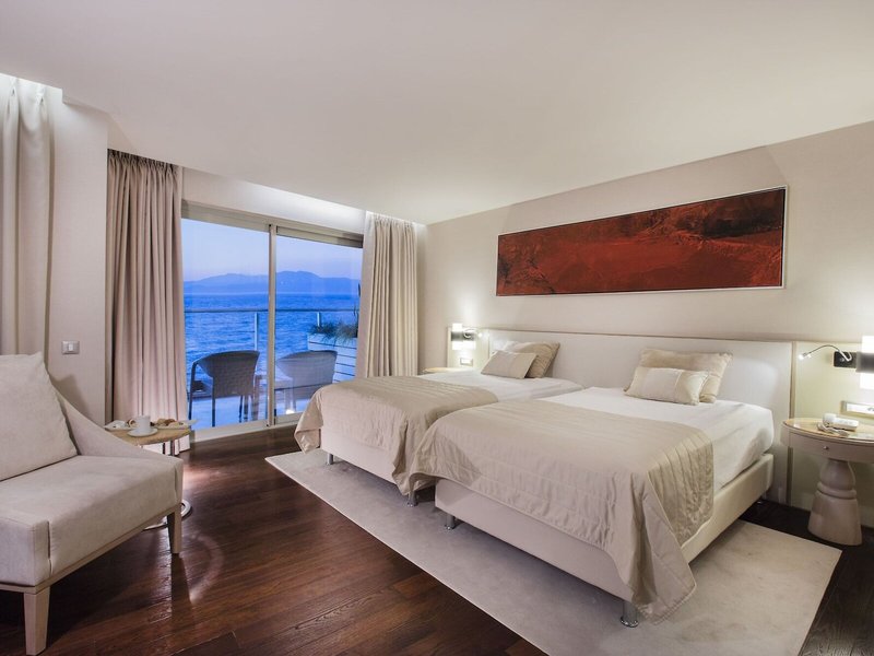 So wohnen Sie: In den Zimmern gibt es eine Küche und ein Badezimmer, für angenehmes Raumklima sorgt eine Klimaanlage. Die Gäste können den Meerblick von Balkon oder Terrasse genießen. Die Zimmer verfügen über ein Queensizebett und ein Sofabett. Außerdem sind ein Safe und eine Minibar verfügbar. Eine Tee-/Kaffeemaschine zählt ebenfalls zur Standardeinrichtung. Hinzu kommen ein Bügelset und eine Hosenpresse. Für optimalen Komfort sorgen ein Telefon mit Direktwahl, ein Flachbildschirmfernseher mit Satellitenempfang und WiFi. Eine Kopfkissenauswahl verspricht gemütliches Wohlbefinden. In den Badezimmern stehen ein Haartrockner, ein Kosmetikspiegel und Bademäntel für den täglichen Gebrauch bereit. Als besondere Annehmlichkeit in den Badezimmern bieten sich den Gästen Kosmetikartikel. Für Eltern mit Kindern stehen Familienzimmer zur Verfügung.