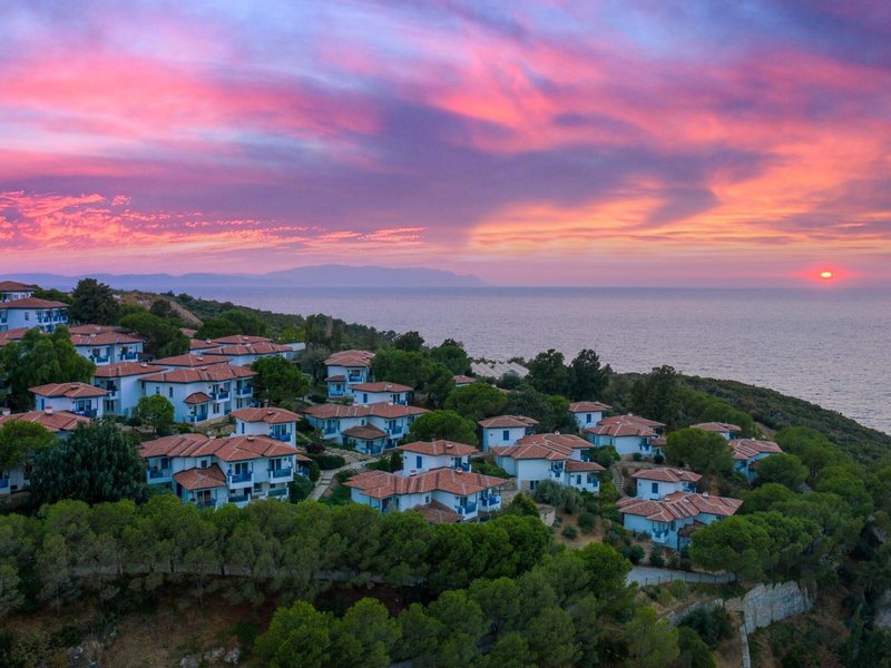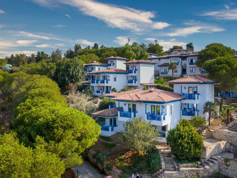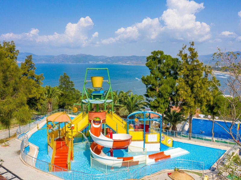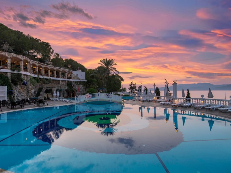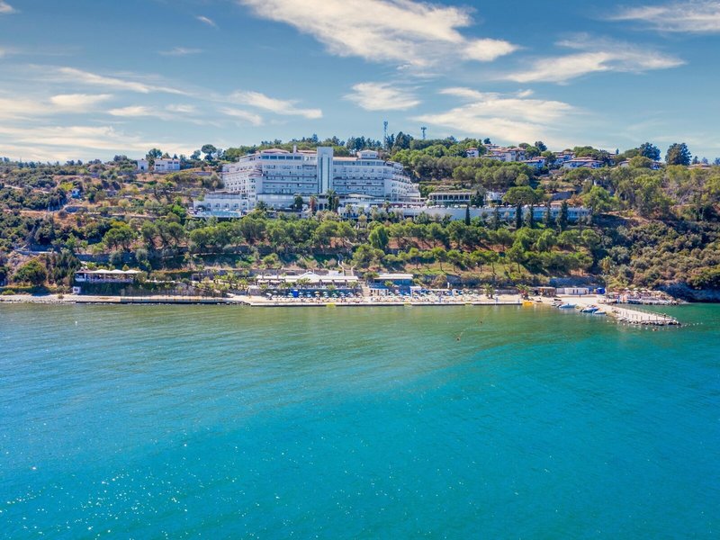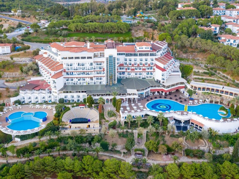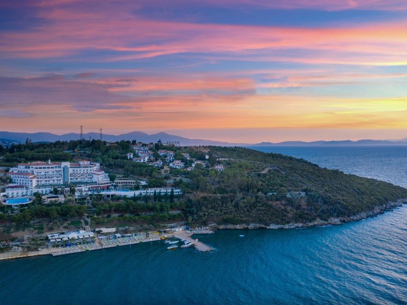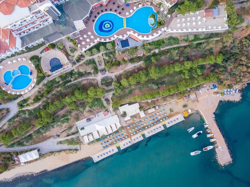 Lage & Umgebung Das Hotel liegt auf einem Hügel mit fantastischem Blick auf das türkisfarbene Meer und direktem Zugang zum Strand. Der beliebte Ferienort Kusadasi mit zahlreichen Geschäften, Restaurants und einem aktiven Nachtleben ist ca. 9 km entfernt. Ebenso befinden sich in der Nähe bedeutende kulturelle Sehenswürdigkeiten wie die antiken Ruinen von Ephesus (11 km) und das Haus der Jungfrau Maria (19 km). Transferzeit ab/bis Izmir ca. 90 Minuten, ab/bis Bodrum ca. 3 Stunden.