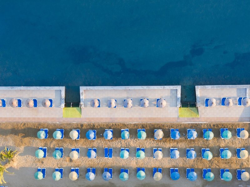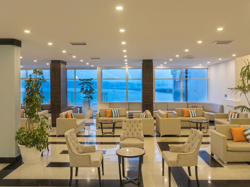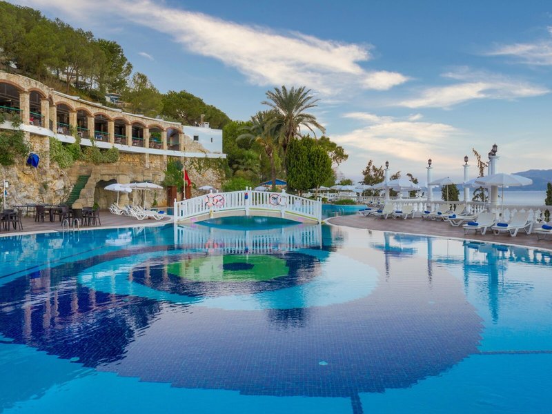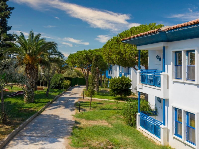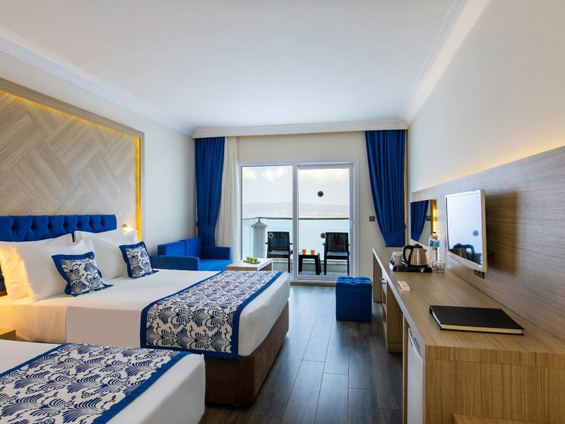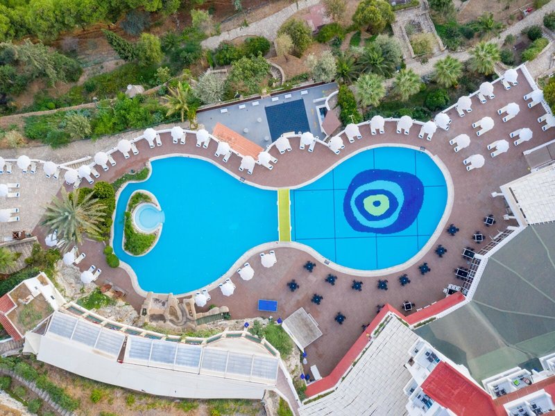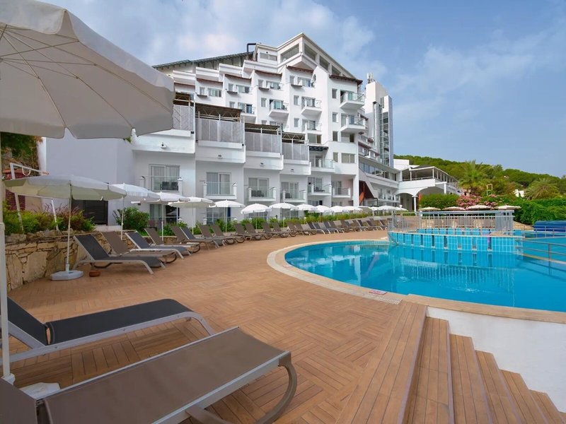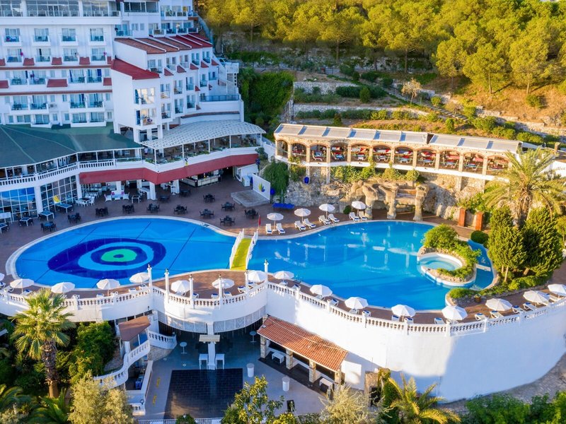 Lage & Umgebung Das Hotel liegt auf einem Hügel mit fantastischem Blick auf das türkisfarbene Meer und direktem Zugang zum Strand. Der beliebte Ferienort Kusadasi mit zahlreichen Geschäften, Restaurants und einem aktiven Nachtleben ist ca. 9 km entfernt. Ebenso befinden sich in der Nähe bedeutende kulturelle Sehenswürdigkeiten wie die antiken Ruinen von Ephesus (11 km) und das Haus der Jungfrau Maria (19 km). Transferzeit ab/bis Izmir ca. 90 Minuten, ab/bis Bodrum ca. 3 Stunden.