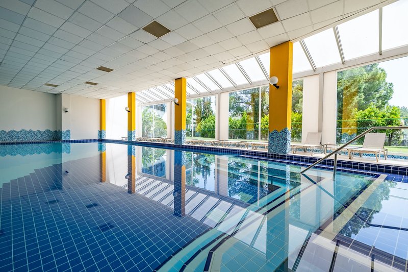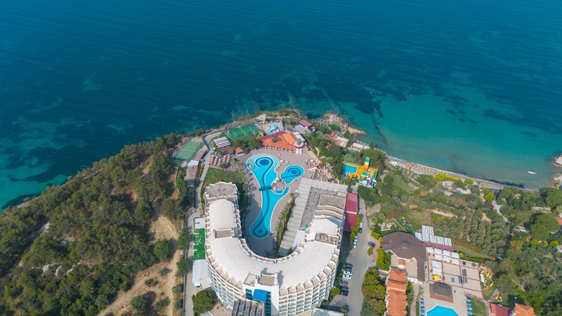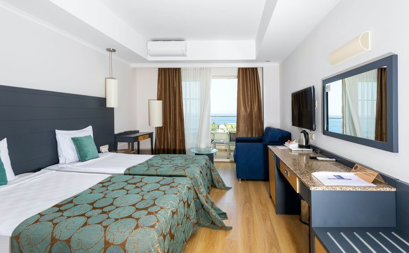 Ausstattung: Das Hotel verfügt über 465 Zimmer, die sich auf U-förmigen Gebäude mit sieben Etagen verteilen. Zu den Annehmlichkeiten zählen eine Lobby mit Lobbybar, Rezeption, ein Hauptrestaurant mit Terrasse, diverse À-la-carte-Restaurants (1 mal bei 5 Nächte Aufenthalt eins mit Reservierung und nach Verfügbarkeit Inclusive, weitere Besuche gegen Gebühr) und mehrere Bars, ein Hallenbad mit Integrierten Kinderbecken, ein gut ausgestattet Spa. Diverse Shops, mehrere Konferenzräume und Friseur (jeweils gegen Gebühr) Wi-Fi ist in der Lobby kostenlos. Im Außenbereich befinden sich ein Hauptpool, Kinderbecken mit drei Wasserrutschen, ein Aquapool für Erwachsene mit sieben Rutschen sowie ein Meerwasser Pool und ein Ruhepool für Erwachsene. Hier und am Strand sind Liegen, Sonnenschirme und Badetücher Inclusive.