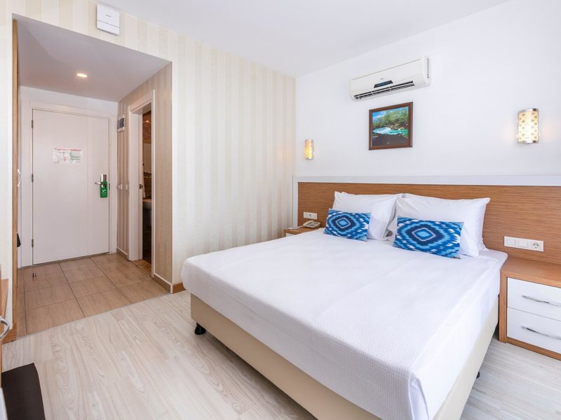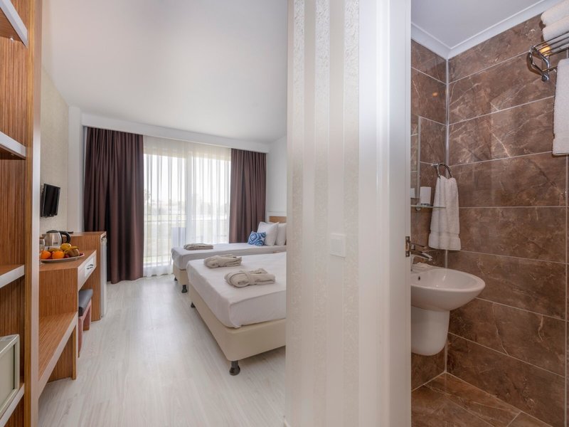 - Kétágyas Standard Large szoba (DZX2), háromágyas szoba, a főépületben, szárazföld felőli oldal, medencére néző kilátás, kertre néző kilátás, kb. 25 m², utolsó részleges felújítás 2022-ben, a szobatípusban található szobák száma: 1, elrendezése a következő: 1 hálószoba, 3 egyszemélyes ágy, babaágy: ingyenes, kérésre és foglalás szükséges, légkondicionáló: ingyenes, időjárásfüggő, egyénileg szabályozható, hideg, meleg, padló: járólap, laminált padló, széf: felár ellenében, vízforraló, minibár: ingyenes, víz: ingyenes, telefon, internet: WLAN/WiFi: ingyenes, televízió: német csatornák, műholdas TV, szobaszerviz: naponta 24 órában, felár ellenében, takarítás: naponta 8:00 - 16:00 között, ingyenes, zuhanyzó, WC, papucs: ingyenes, hajszárító, erkély