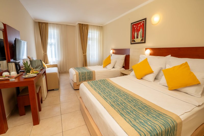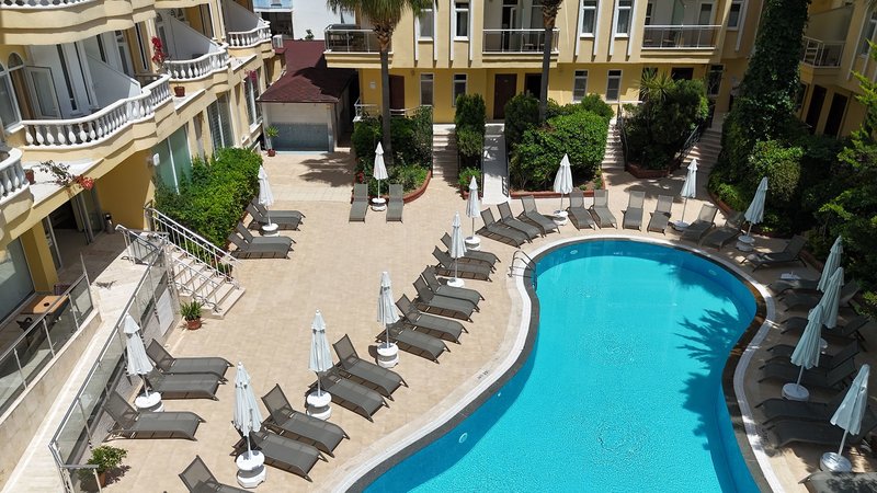 Felszereltség: Ez a kényelmes szállodakomplexum két négyszintes épületből áll, és összesen 146 szobával rendelkezik. A szálloda számos szolgáltatást kínál, többek között recepciós előcsarnokot, lifteket, teraszos büfééttermet, két bárt és műholdas TV-sarkot. A Wi-Fi ingyenes az egész komplexumban. Nyáron a kertben két édesvizű medence (amelyek közül az egyik szezonálisan tart nyitva, és a szálloda belátása szerint fűthető), napozóterasz és snack bár található. A napozóágyak, párnák és napernyők ingyenesen állnak rendelkezésre a medencénél és a strandon.