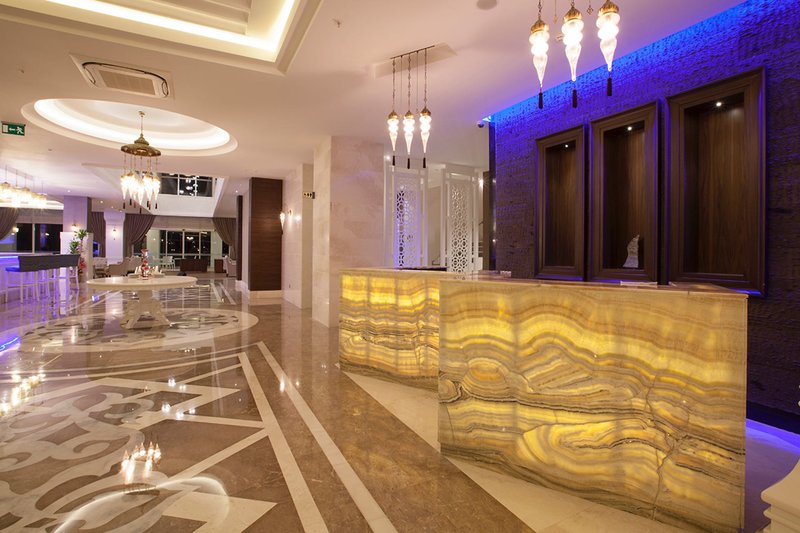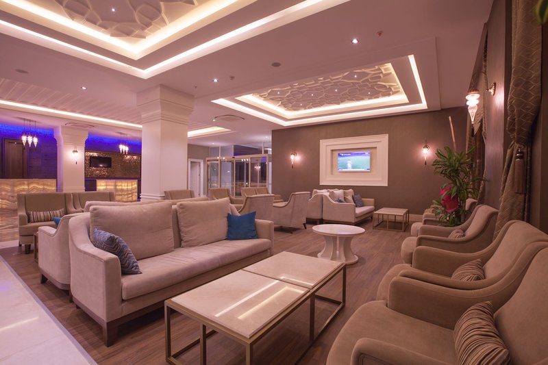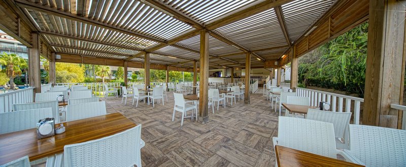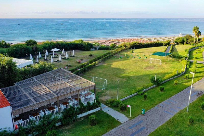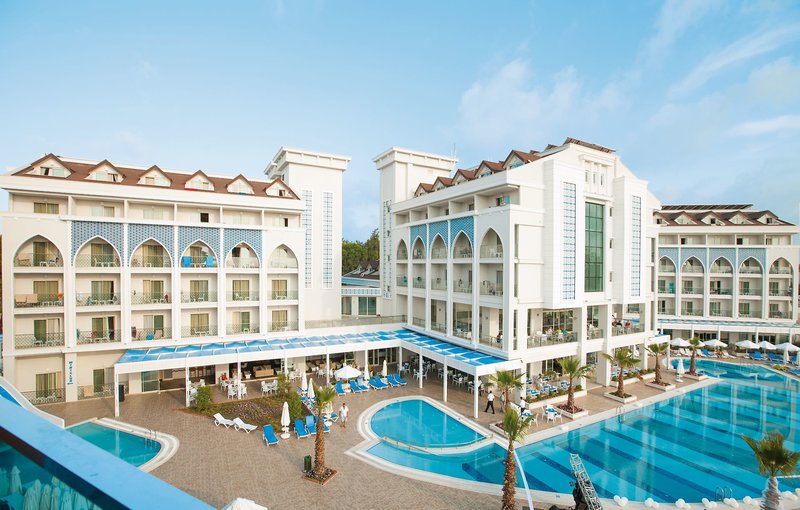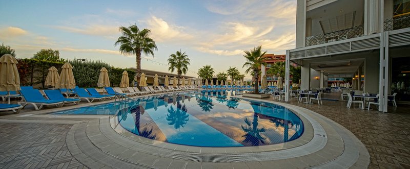 Felszereltsége: A tetszetős kialakítású komfort szálloda öt emeletből, három épületből és összesen 177 szobából áll. A számos szolgáltatás közé tartozik a hall recepcióval, liftek, hívogató ülősarokkal és lobbibárral, a barátságosan berendezett fő étterem terasszal, két à la carte étterem (7 éjszakás tartózkodás esetén, előzetes foglalás esetén és a rendelkezésre állás függvényében). ), további bárok, bevásárlóközpont különféle üzletekkel (térítés ellenében), konferenciatermek, diszkó és modern wellness részleg, valamint fűtött fedett medence (szezontól függően). A Wi-Fi az egész létesítményben elérhető. A gyönyörűen kialakított szabadtéri területen található egy amfiteátrum az esti rendezvényeknek, a fő uszoda, egy másik medence két csúszdával (óránként, április 15-től október 15-ig) és a hívogató snack bár. Itt és a strandon strandbárral, nyugágyak, párnák, napernyők és strandtörölközők (kártyával egyszer ingyenesen cserélhető) az ár tartalmazza.