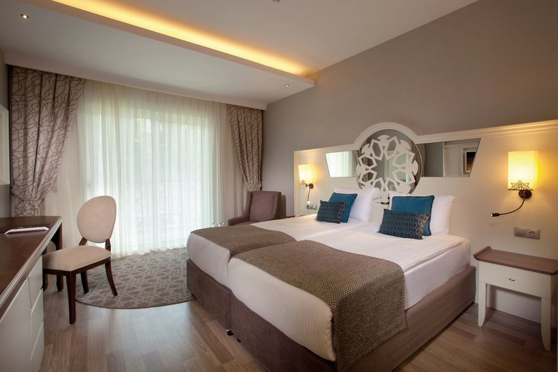 Kétágyas szoba: Az elegánsan berendezett szobák zuhanyzóval/WC-vel, hajszárítóval, telefonnal, széffel, légkondicionálóval (központi vezérlésű), műholdas LCD TV-vel, minibárral, teafőzővel, laminált padlóval és erkéllyel rendelkeznek (D). A medencére néző kilátás felár ellenében (PD) foglalható. Egyágyas szoba = kétágyas szoba egyszemélyes használatra (DE/PDE).
