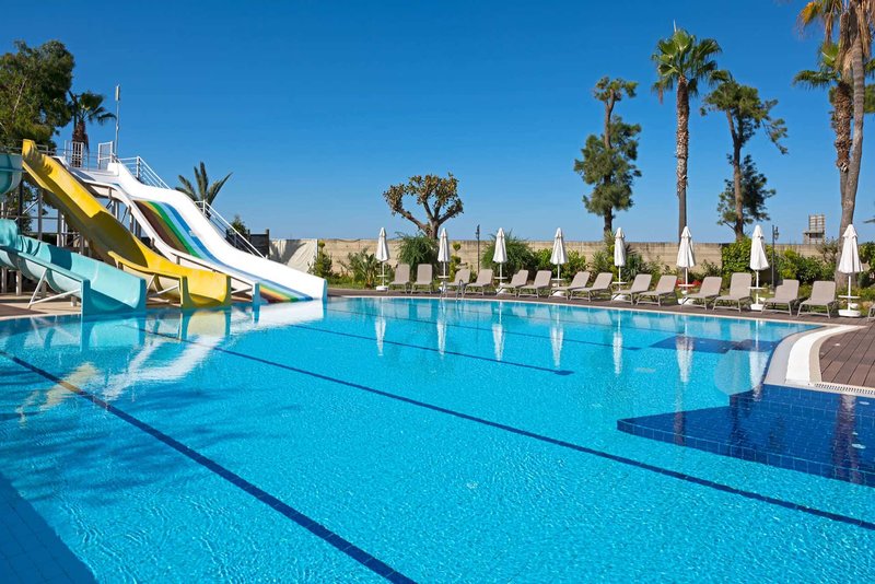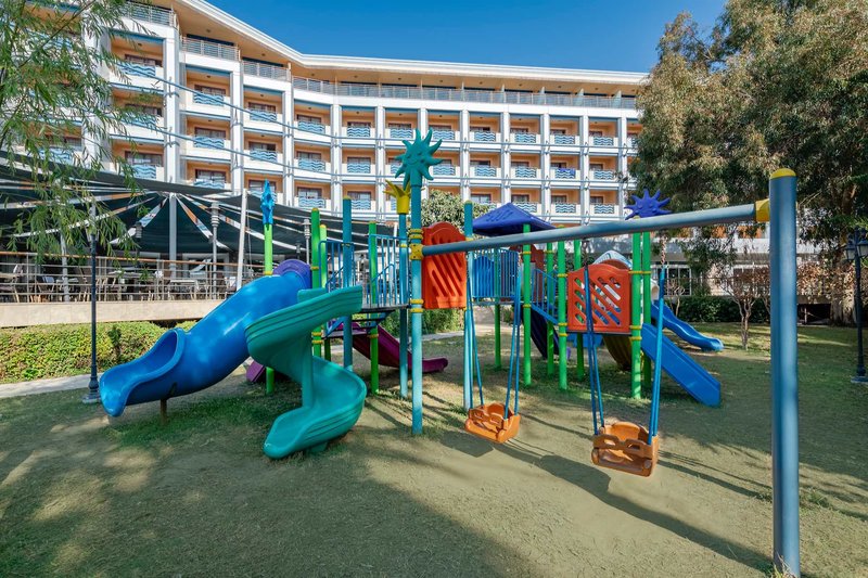 Felszereltség: Ez a népszerű üdülőszálloda, amely számos visszatérő vendéget vonz, összesen 334 szobával rendelkezik (lift áll rendelkezésre). A szálloda épületében egy elegáns előcsarnok található recepcióval, ülősarokkal és lobbybárral, konferenciatermek, egy panorámás büféétterem terasszal, valamint számos à la carte étterem (heti egy, a szabad helyek függvényében és előzetes foglalás esetén), egy ajándékbolt és egy minimarket (felár ellenében). A Wi-Fi ingyenesen elérhető a lobbyban; a szobákban és a szálloda egyéb területein a Wi-Fi felár ellenében érhető el. A jól karbantartott kertben két édesvizű medence található, az egyikben egy beépített gyermekmedence és három vízicsúszda (120 cm mély), egy külön gyermekmedence (40 cm mély), napozóterasz, medence/snack bár és egy strandbár. A napozóágyak, párnák, strandtörölközők és napernyők ingyenesen állnak rendelkezésre a vendégek számára itt és a strandon; ezek a mólónál felár ellenében vehetők igénybe. Az időjárási körülmények miatt egyes kültéri létesítmények csak a nyári hónapokban tartanak nyitva.