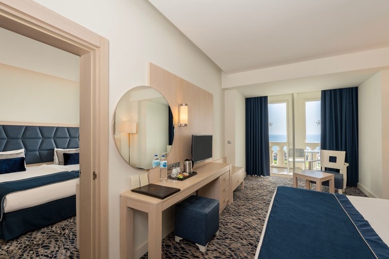 Familienzimmer: Die ca. 45-56 m² grossen Familienzimmer bestehen aus 2 Schlafzimmern mit Verbindungstür (es gibt ein Schlafzimmer mit Doppelbett, ein Schlafzimmer mit zwei Einzelbetten) ansonsten ähnliche Ausstattungselemente wie die Superior Zimmer, (F2G). Meerblick Zimmer sind gegen Aufpreis buchbar (F2M).