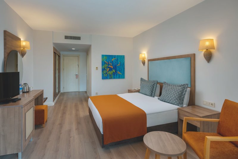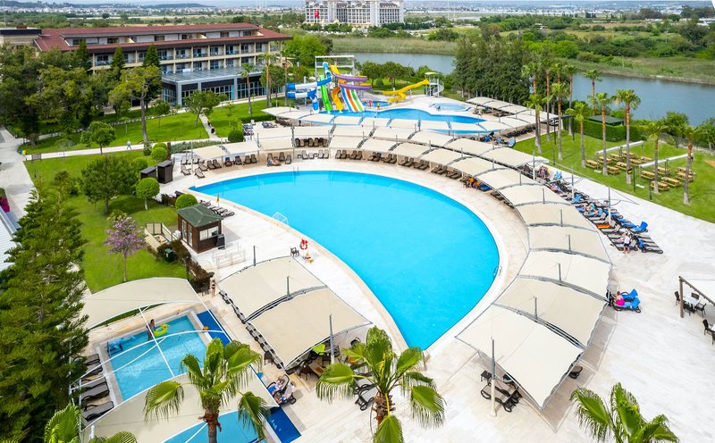 Felszereltség: Ez a gondtalan nyaralást kínáló üdülőhely egy főépületből, két melléképületből (mindegyik lifttel) és számos villából áll, összesen 432 szálláshellyel. A vendégek rendelkezésére áll egy modern előcsarnok recepcióval, kényelmes ülőhelyekkel és egy lobbybárral; egy büféétterem terasszal; különféle à la carte éttermek (április 1-jétől szeptember 30-ig tartanak nyitva; minden étterem gyermekmenüt kínál, a hét hat napján felváltva; török konyha szerepel az árban tartózkodásonként egyszer, foglalással; a többi à la carte étterem szervizdíj ellenében látogatható); és számos bár (köztük egy csak felnőttek számára fenntartott bár). Van egy játékterem, több üzlet és egy fodrászat (mindegyik felár ellenében), valamint egy vonzó wellnessrészleg (felár ellenében). A Wi-Fi a szálloda egész területén, a szobákban és a strandon is elérhető. Május 1-jétől október 31-ig a tágas kertrészlegben gyermekrészleg található. Az esti rendezvényeknek otthont adó amfiteátrum, a "Gyermekvilág" fantasztikus programokkal a kicsiknek, és természetesen az édesvizű medence csúszdákkal (4 éves kortól, alkalmanként néhány órára nyitva; 7 év alatti gyermekeket szülői kíséret szükséges), napozóterasz, napozópázsitok és medence/snack bár. A napozóágyak, strandtörölközők és napernyők a medencénél és a strandon (időjárás függvényében) benne vannak az árban. A strandpavilonok felár ellenében vehetők igénybe. A fedett medence (téli szezonban nyitva) és az integrált gyermekmedence a szezonon kívül fűtött.