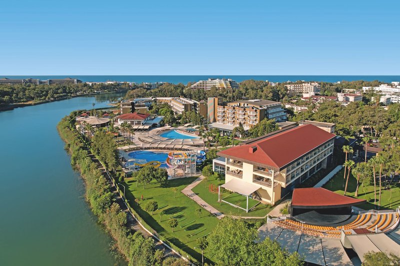 Ausstattung: Das Feriendomizil für unbeschwerte Urlaubstage besteht aus einem Haupthaus, zwei Nebengebäuden (jeweils mit Lifts) und mehreren Villen mit insgesamt 432 Wohneinheiten. Es stehen eine moderne Empfangshalle mit Rezeption, gemütlichen Sitzecken und Lobbybar, das Buffetrestaurant mit Terrasse, diverse À-la-carte-Restaurants (ab 1.4- 30.9., alle Restaurants haben ein Kinder-Menü, sechsmal wöchentlich und abwechselnd geöffnet; türkische Küche ist einmal pro Aufenthalt mit Reservierung inklusive, restliche À-la-carte-Restaurants sind gegen Servicegebühr), diverse Bars (auch eine Adults-Only Bar) zur Verfügung. Außerdem gibt es eine Game-Hall und mehrere Geschäfte und ein Friseur (jeweils gegen Gebühr) sowie ein ansprechender Wellnessbereich (gegen Gebühr). Im gesamten Hotelbereich sowie auf den Zimmern und am Strand ist Wi-Fi inklusive. In der großzügig angelegten Gartenanlage befindet sich vom 1.5. bis 31.10. das Amphitheater für die Abendveranstaltungen, die "Kinderwelt" mit tollen Angeboten für unsere kleinen und natürlich die Süßwasser-Poollandschaft mit Wasserrutschen (für Kinder ab 4 Jahre und stundenweise, Kinder unter 7 Jahren nur in Begleitung eines Elternteils), Sonnenterrasse, Liegewiesen und Pool-/Snackbar. Liegen, Badehandtücher und Sonnenschirme sind am Pool sowie am Strand inklusive (wetterbedingt). Pavillons am Strand gegen Gebühr. Hallenbad (in der Wintersaison geöffnet) mit intergriertem Kinderpool Vor/Nachsaison beheitzt.