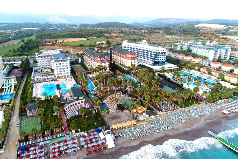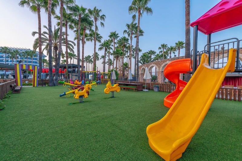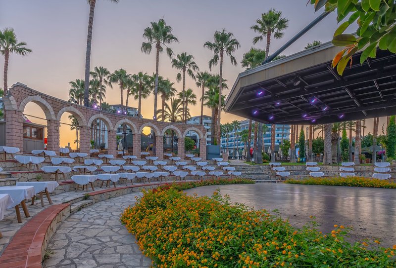 Ausstattung: Das stilvolle Urlaubshotel ist auf einem 20.000 m² Gelände errichtet und verfügt über 373 Zimmer die sich auf sechs Etagen verteilen (Lifts vorhanden). Zu den verschiedenen Hoteleinrichtungen zählen eine elegante Empfangshalle mit Rezeption, Lobbybar und einladenden Sitzgruppen, das Buffetrestaurant mit Terrasse, Diskothek, Patisserie und ein Hallenbad (im Winter geöffnet). Außerdem verschiedene Geschäfte und ein Friseure (jeweils gegen Gebühr). Im Außenbereich befinden sich zwei Süßwasser-Swimmingpools mit separatem Kinderbecken und drei Wasserrutschen (wetterbedingt/stundenweise). Am Strand und an den Pools sind Sonnenschirme und Liegen kostenfrei, Badetücher liegen auf den Zimmer bereit (Wechsel gegen Gebühr).