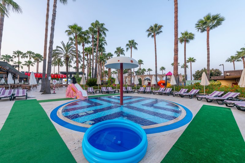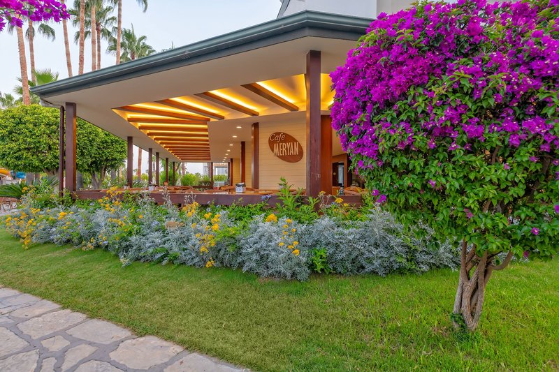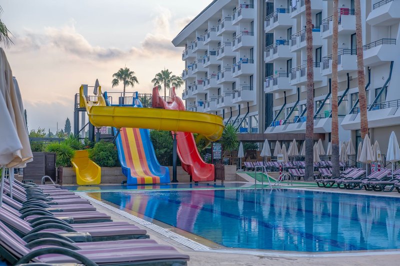 Felszereltség: A stílusos üdülőszálló 20.000 m²-es telken épült, és hat emeleten 373 szobával rendelkezik (lift is rendelkezésre áll). A szálloda különféle szolgáltatásai közé tartozik az elegáns lobby recepcióval, a lobby bár és a hívogató pihenősarok, a teraszos büféétterem, a diszkó, a cukrászda és a fedett medence (télen nyitva). Különféle üzletek és fodrászat is találhatók (mindkettő térítés ellenében). Kint két édesvizű medence található külön gyermekmedencével és három csúszdával (időjárástól függően/óránként). A strandon és a medencéknél a napernyők és nyugágyak térítésmentesen vehetők igénybe, a szobákban strandtörölköző biztosított (térítés ellenében cserélhető).