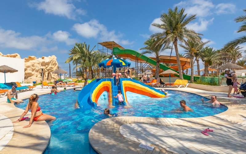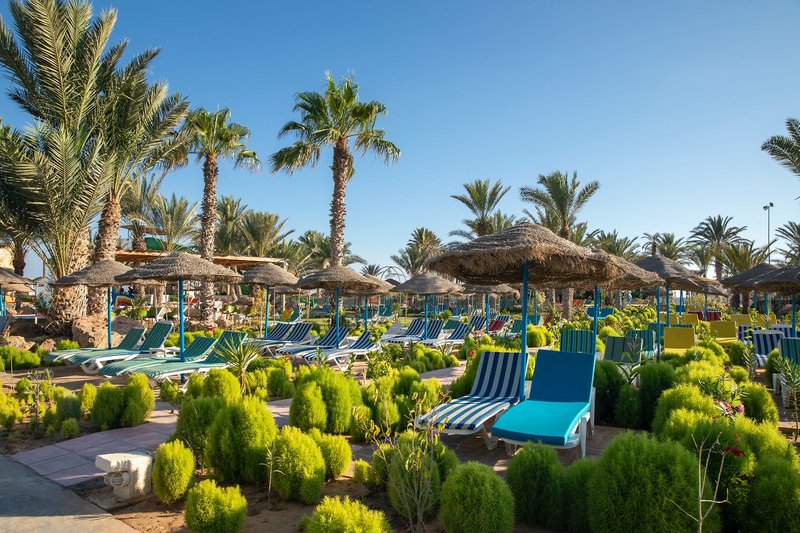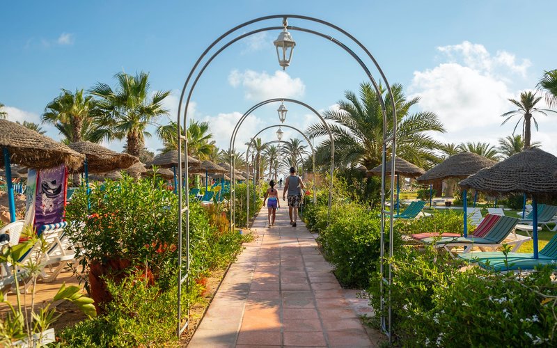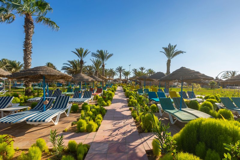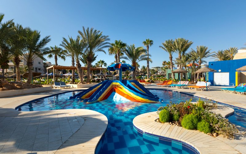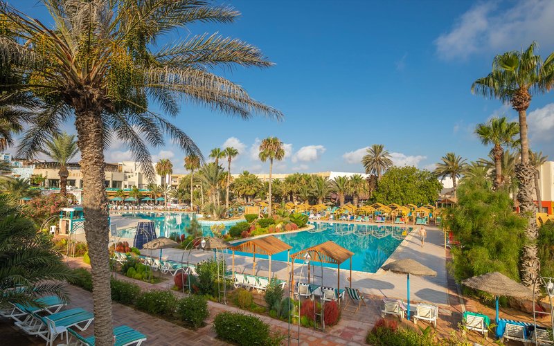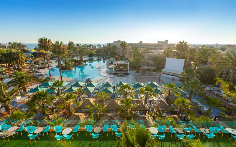 Ausstattung: Die im landestypischen Stil gehaltene Anlage verfügt über 457 Zimmer und besteht aus einem Haupt- und mehreren Nebengebäuden "Menzels", Empfangsbereich mit Rezeption, Lobbybar, Hauptrestaurant, ein Themenrestaurant "Tunisian", diverse Bars, Maurisches Cafè, Amphietheater (15.6.-15.9.), Hallenbad (beheizbar, 1.11.-30.4.) und Thalassotherapiezentrum. In der Außenanlage liegt ein großer Swimmingpool mit separatem Kinderbecken inkl. Rutsche und Sonnenterrasse sowie eine Pool-/Snackbar und ein Strandbar (in der Sommersaison geöffnet). Liegen, Auflagen und Sonnenschirme sind am Pool und am Strand inklusive, Badetücher sind gegen Gebühr erhältlich.