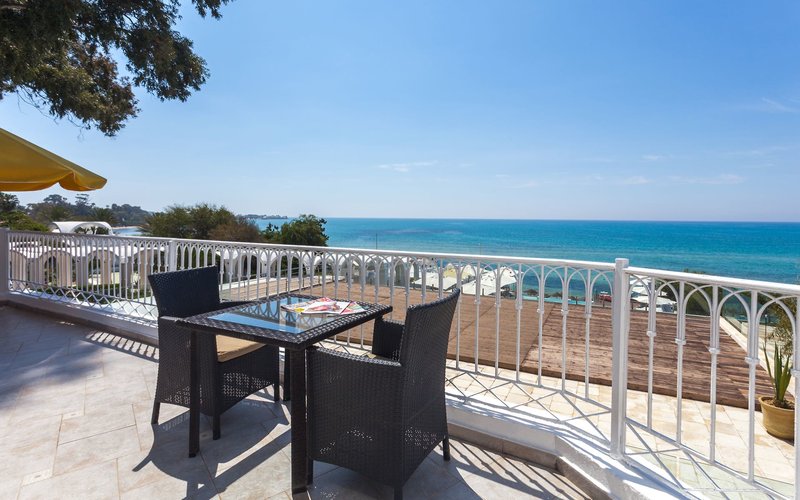 Juniorsuiten (Sommer): Wie die Doppelzimmer, jedoch mit Terrasse und Meerblick. Außerdem verfügen diese Zimmer über ein jeweils separates Wohnzimmer und WC (JS2).